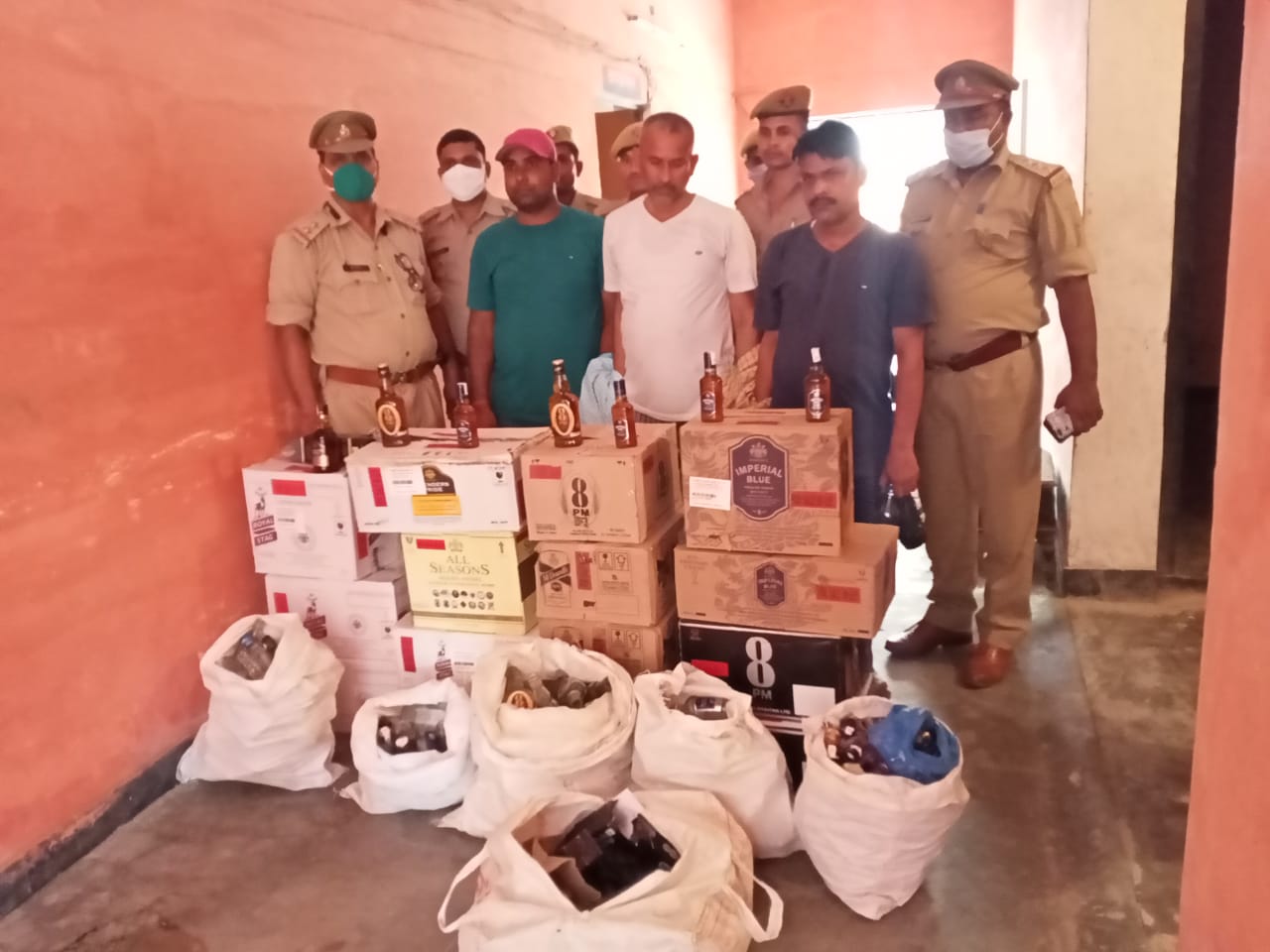 बलिया। पुलिस अधीक्षक बलिया के निर्देशन में शराब की तस्करी पर रोकथाम एवं बरामदगी के क्रम में दिनांक 29.09.2020 की रात्रि सहतवार पुलिस को मुखबीर द्वारा सूचना प्राप्त हुई कि श्रीराम जानकी मैरिज हाल चांदपुर रोड बलेउर में 03 शराब तस्कर मिलावटी अंग्रेजी शराब तैयार कर रहे हैं जिसकी सूचना पर प्रभारी निरीक्षक सहतवार मय फोर्स के मौके पर पहुंचे तो देखा गया कि 03 व्यक्ति अंग्रेजी शराब की भरी बोतल से कुछ शराब एक टब में निकाल कर टब में पानी व अन्य कुछ पदार्थ मिलाकर खाली बोतल में पुनः भर कर पैक करते हुए दिखाई दिए तथा पुलिस को देखते ही तीनों व्यक्ति भागने का प्रयास करने लगे जिनको मौके पर ही दिनांक 29/30 की रात्रि समय करीब 01.00 बजे सहतवार पुलिस द्वारा गिरफ्तार कर लिया गया।